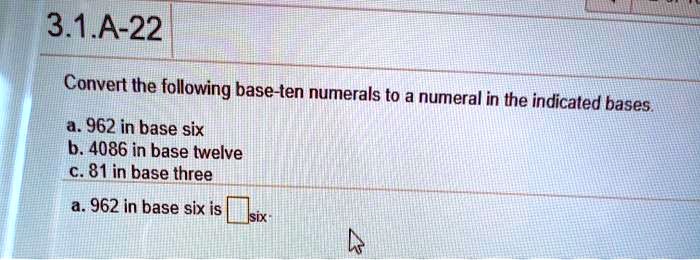 Solved 3 1 A 22 Convert The Following Base Ten Numerals To A Numeral In The Indicated Bases 962 In Base Six B 4086 In Base Twelve C 81 In Base Three A 962 In Base Six Is